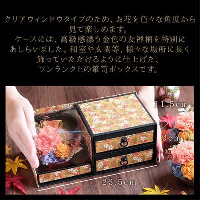 他の画像を見る 使えるオリジナル和箪笥箱入り 敬老の日 プリザーブドフラワー&上生菓子セット「旬麗(ときうらら)」 箪笥箱入り 送料無料(北海道・沖縄を除く) 価格 ¥ 4,680 税込 在庫切れ 詳細を見る お気に入りに登録する