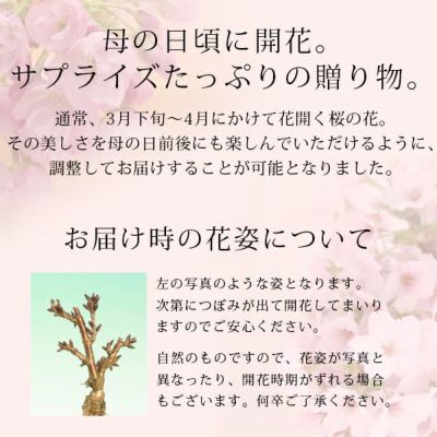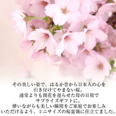 他の画像を見る 母の日に、コンパクトサイズでプレゼントに最適。 母の日 桜盆栽 選べる3品種(「旭山」「御殿場」「枝垂れ」) 送料無料(北海道・沖縄を除く) 価格 ¥ 6,480 税込 在庫切れ 詳細を見る お気に入りに登録する