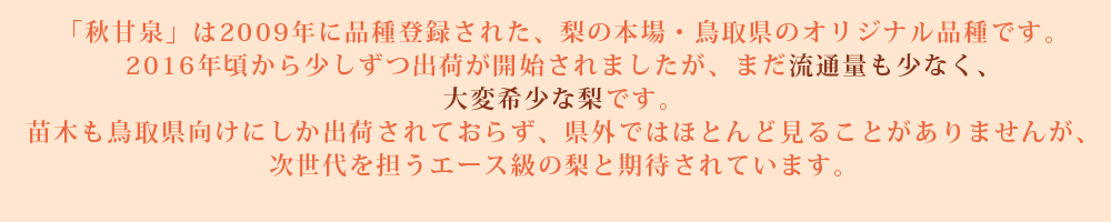 赤梨「豊水」と青梨「おさ二十世紀」を掛け合わせて作られた「秋甘泉」は、糖度が高く、赤梨らしい優しい食感を併せ持った新品種です。光センサーを通し、糖度は12.5度以上を保証。同じ「甘泉」の名前を持つ「新甘泉」の出荷が終わる、初秋に旬を迎える梨です。