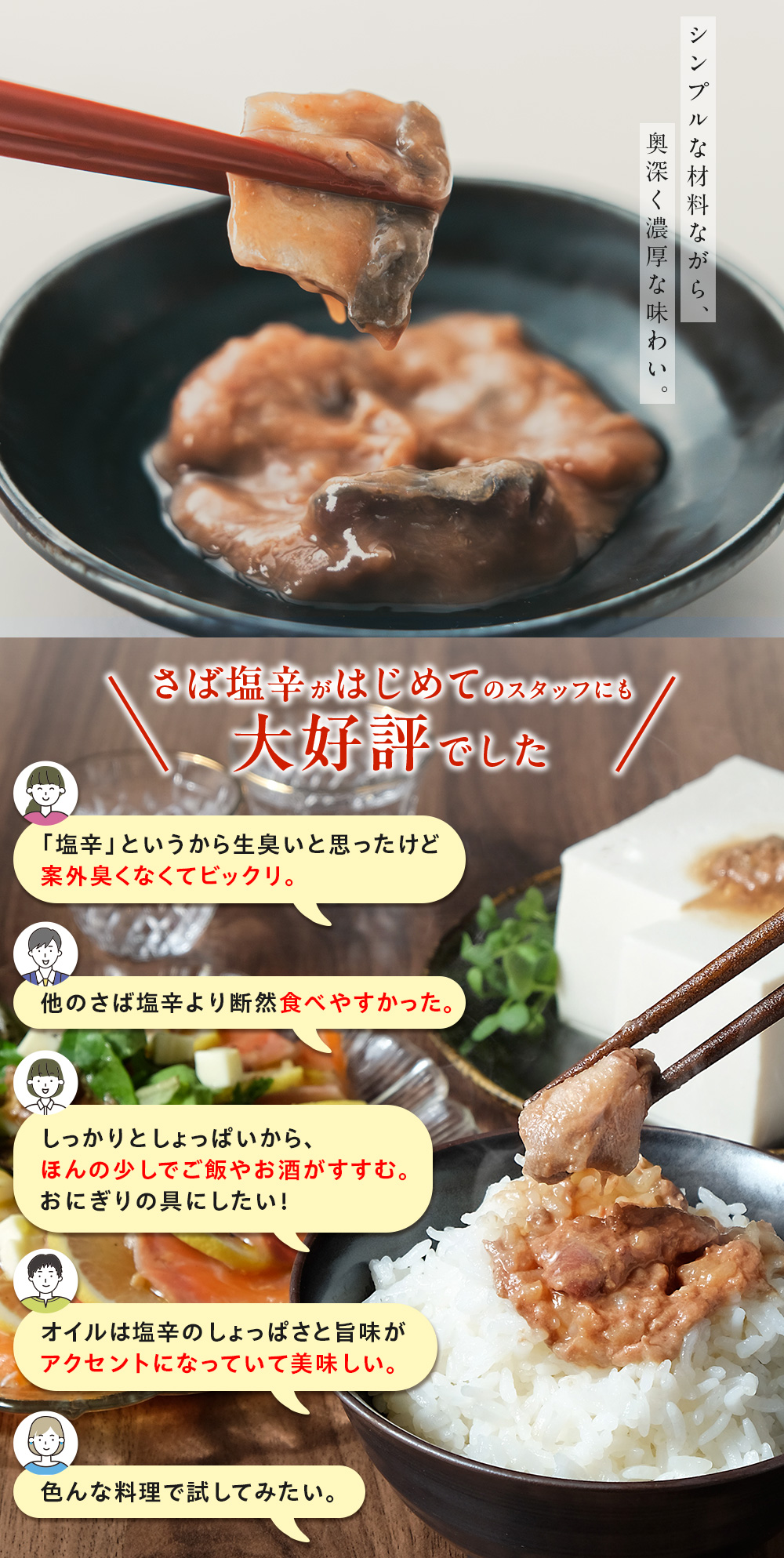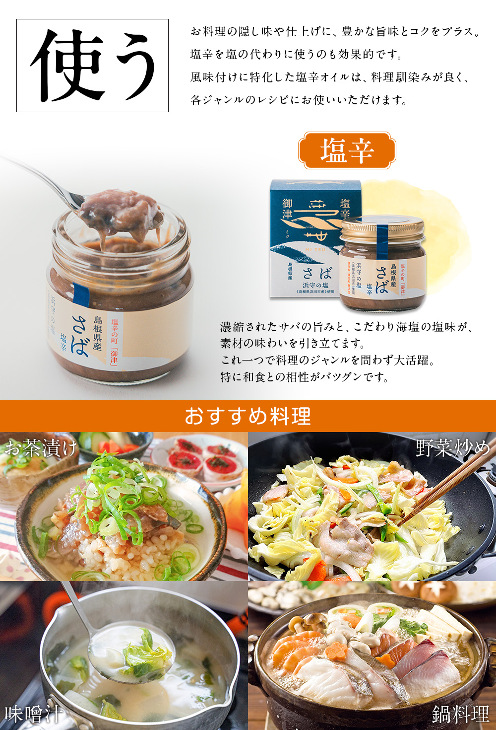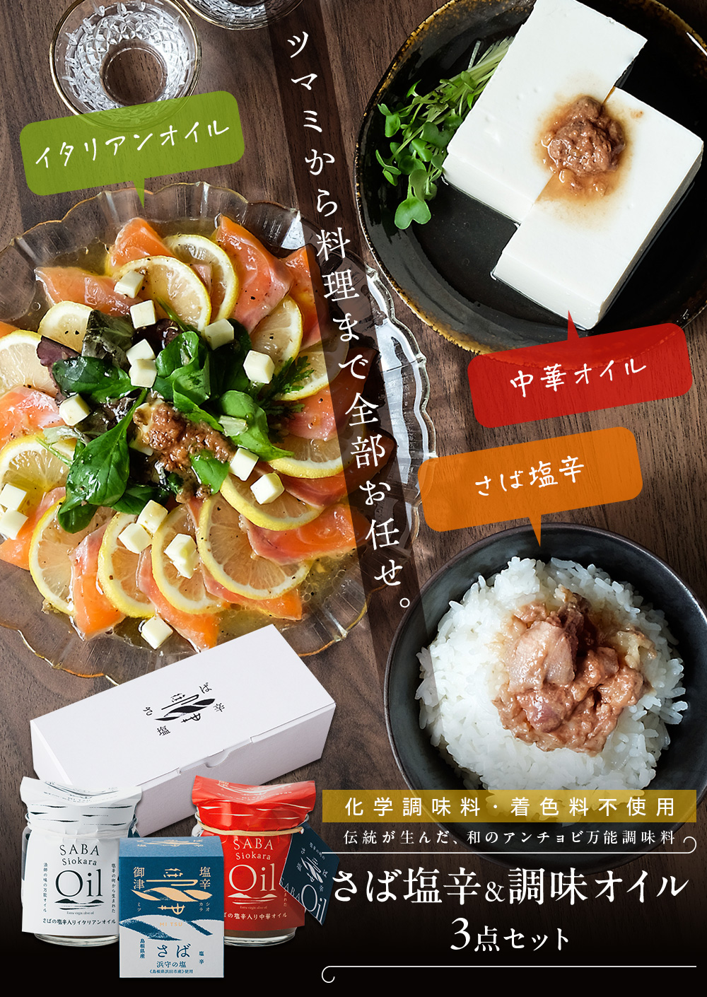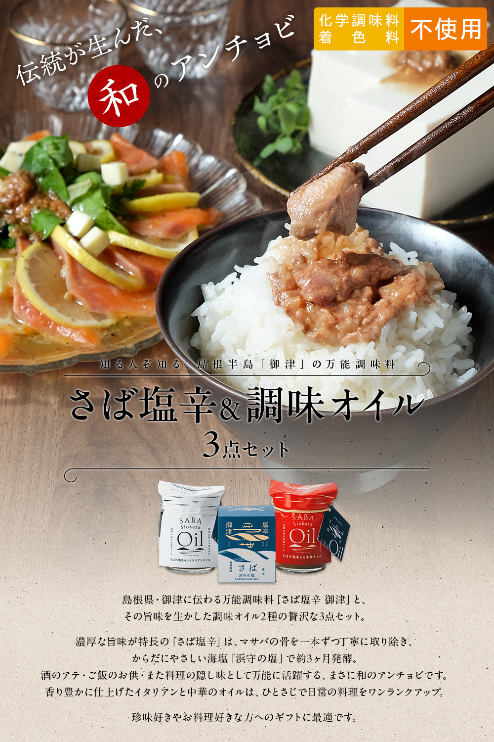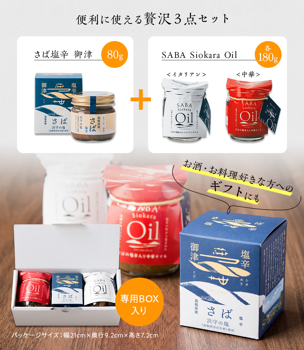 島根県・御津に伝わる伝統製法で仕込んだ「さば塩辛」とその旨味を生かした調味オイル2種を詰め合わせた、化学調味料・着色料不使用の贅沢な3点セットです。新鮮なマサバの骨を一本ずつ丁寧に取り、浜田市産の昔ながらの釜炊き塩「浜守の塩」で約3カ月発酵させた塩辛は、ギュッと旨みが凝縮。アツアツご飯に酒のお供、料理の隠し味としても万能に活躍します。調味オイルはオリーブオイルベースにガーリックが香るイタリアン、ごま油と花椒が香る中華の2種類。ひとさじで日常の料理をプロの味へと引き上げます。