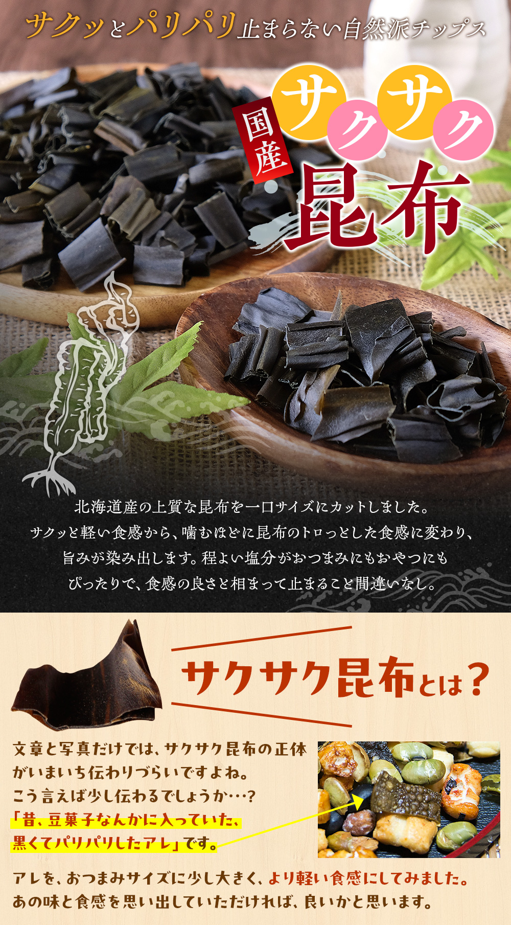 スナックのように、サクッとほどける食感がクセになる自然派おつまみ。北海道産の上質な昆布のみを使用し、食物繊維もミネラルもしっかり摂れます。ほどよい塩分は、お酒にもおやつにもピッタリで、食感の良さと相まって止まらなくなること間違いなし。当店スタッフ一押しのおつまみです。