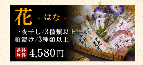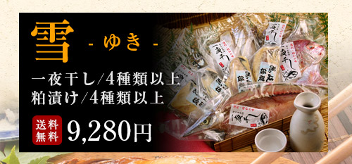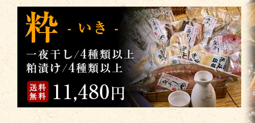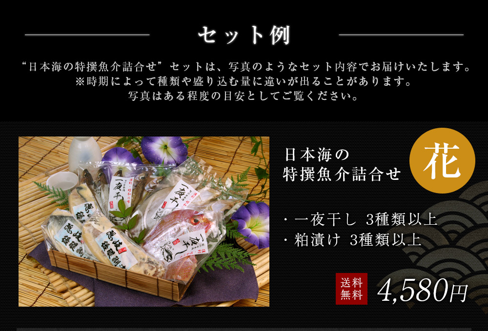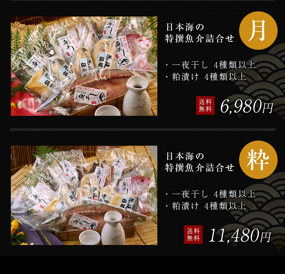 素材はすべて天然・日本海産から厳選。「一夜干し」と「粕漬け」の贅沢セットを特別なギフト用に。懐かしの昭和の味・復刻版です。もらってうれしい風呂敷包みでお届けします。