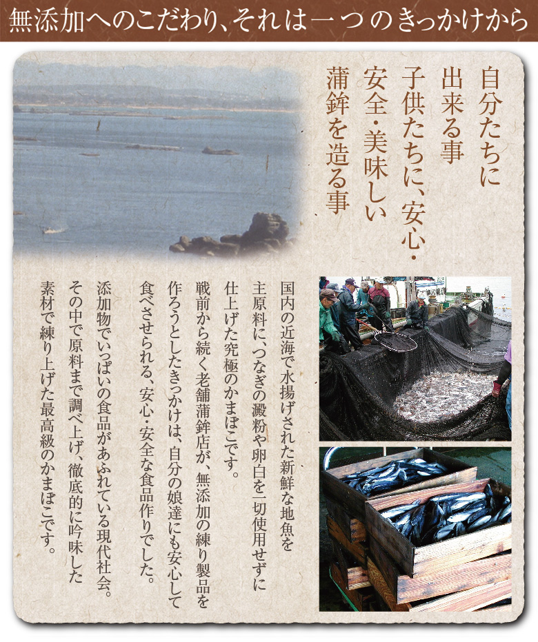 新鮮な地魚を主原料にこだわりの魚醤、昆布だし、塩などで味付け、つなぎの澱粉や卵白を使わずに仕上げた究極のかまぼこセット。年末限定で「寿」の文字も入った、お正月にうれしい逸品です。