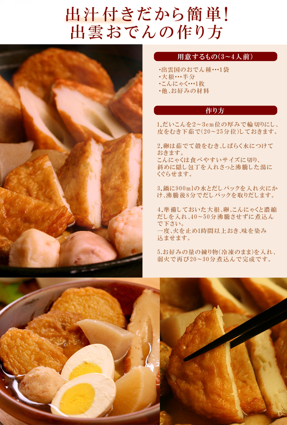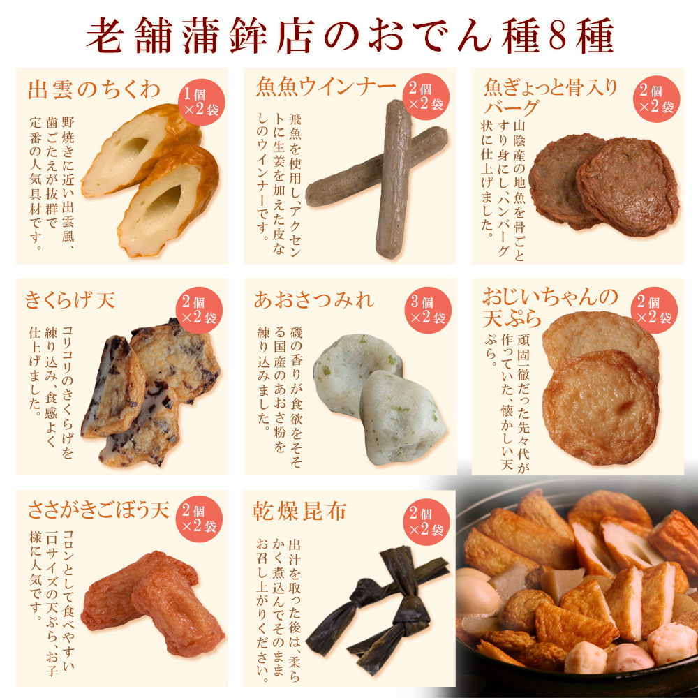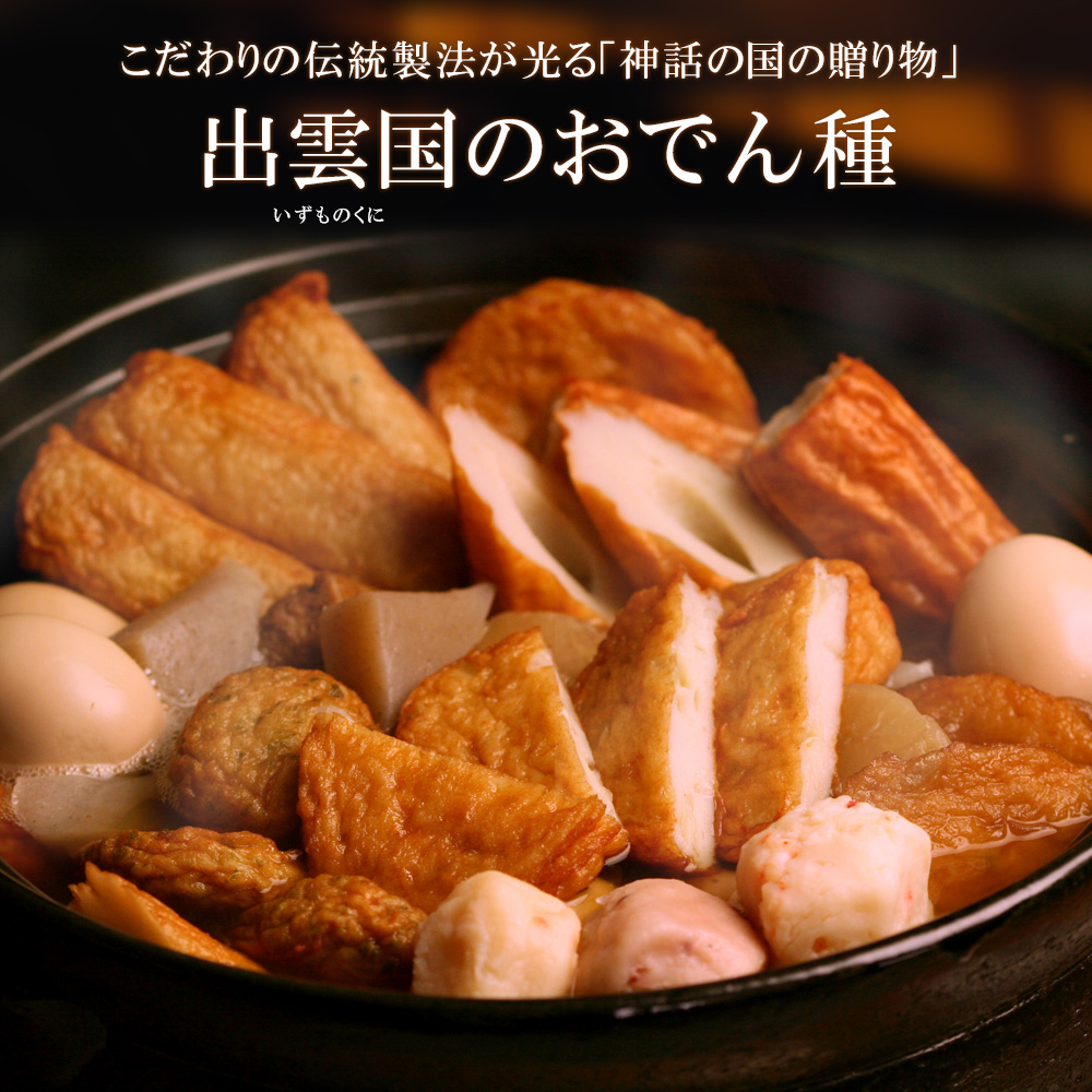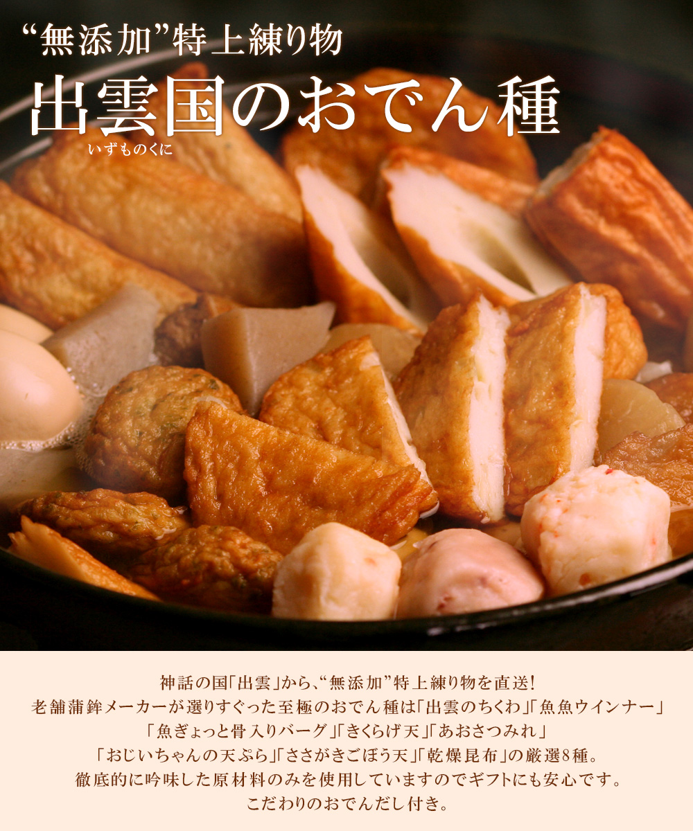 神話の国「出雲」から、“無添加”特上練り物を直送!老舗蒲鉾メーカーが選りすぐった至極のおでん種(だし付き)。徹底的に吟味した原材料のみを使用していますのでギフトにも安心です。