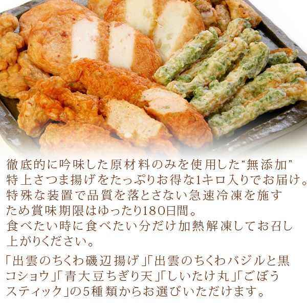 他の画像を見る 食べたい分だけ加熱解凍!たっぷりお得な常備用 “無添加”特上さつま揚げ「出雲国の黄金揚げ」1kg(500g×2袋) 選べる5種 送料無料(北海道・沖縄を除く) 価格 ¥ 4,280 税込 詳細を見る お気に入りに登録する