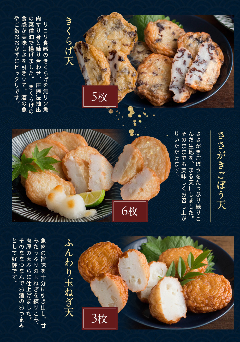 【ささがきごぼう天】魚肉(日本)、ごぼう(日本)、食用菜種油、馬鈴薯澱粉、砂糖、魚醤(イワシ、食塩)、食塩、鰹だし、昆布だし、味醂