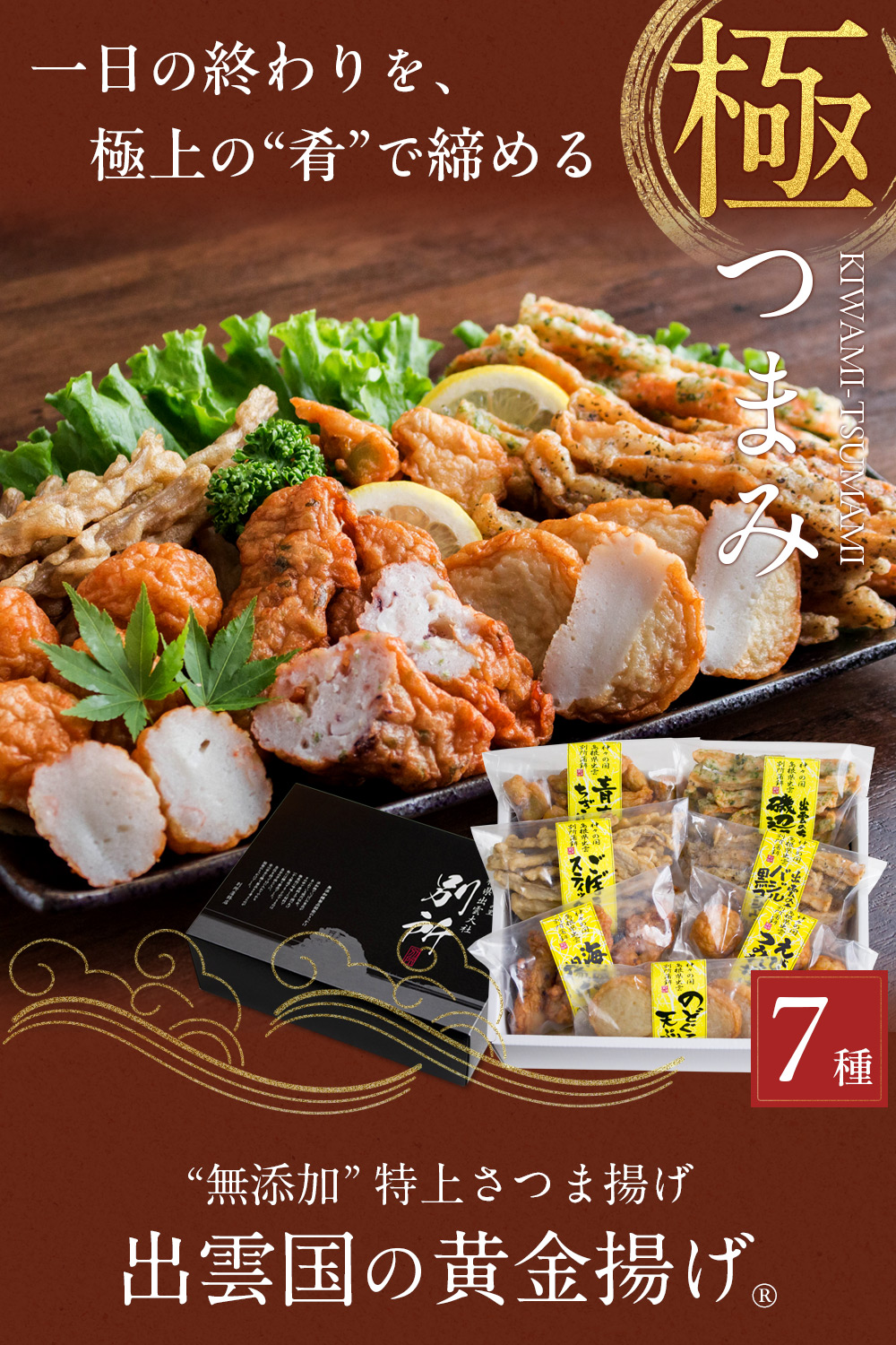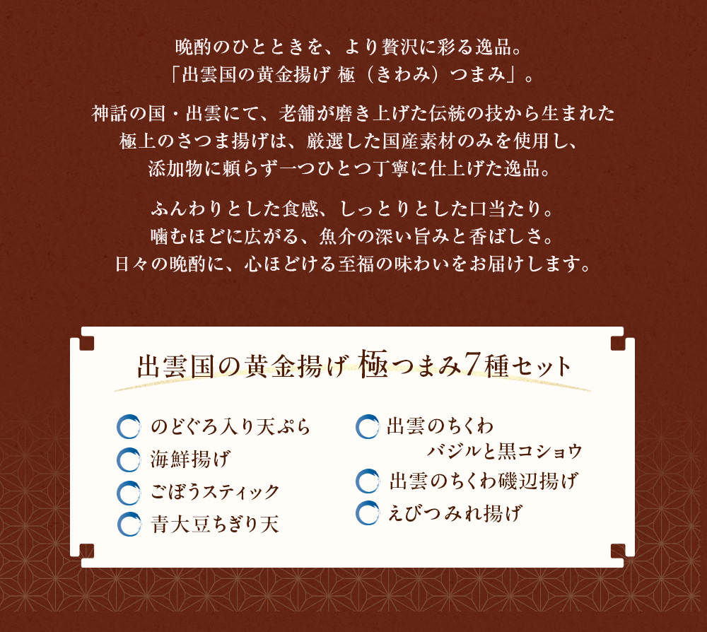 【のどぐろ入り天ぷら】 魚肉(タラ(日本)、のどぐろ(アカムツ)(日本))、食用菜種油、馬鈴薯澱粉、砂糖、魚醤(イワシ、塩)、食塩、鰹だし、昆布だし、味醂