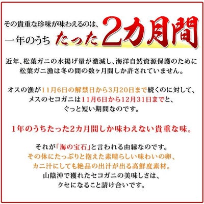 他の画像を見る ご贈答用にも!期間限定の“冬の味覚の女王” セコガニ(せいこ蟹 親がに 松葉がにの雌)150g前後(中サイズ)×7枚 日本海産 未冷凍 お歳暮ギフト 送料無料 価格 ¥ 13,980 税込 在庫切れ 詳細を見る お気に入りに登録する