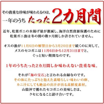 他の画像を見る ご贈答用にも!期間限定の“冬の味覚の女王” セコガニ(せいこ蟹 親ガニ 松葉がにの雌)180g前後(大サイズ)×3枚 日本海産 未冷凍 お歳暮ギフト 送料無料 価格 ¥ 8,980 税込 詳細を見る お気に入りに登録する
