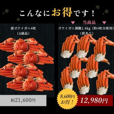 他の画像を見る 解凍してすぐ食べられる!お得な訳ありズワイ蟹足 ボイルズワイガニ 肩脚1.4kg(4~6人前) 訳あり セクション かに カニ 蟹 送料無料(北海道・沖縄を除く) 価格 ¥ 12,980 税込 カートに入れる お気に入りに登録する