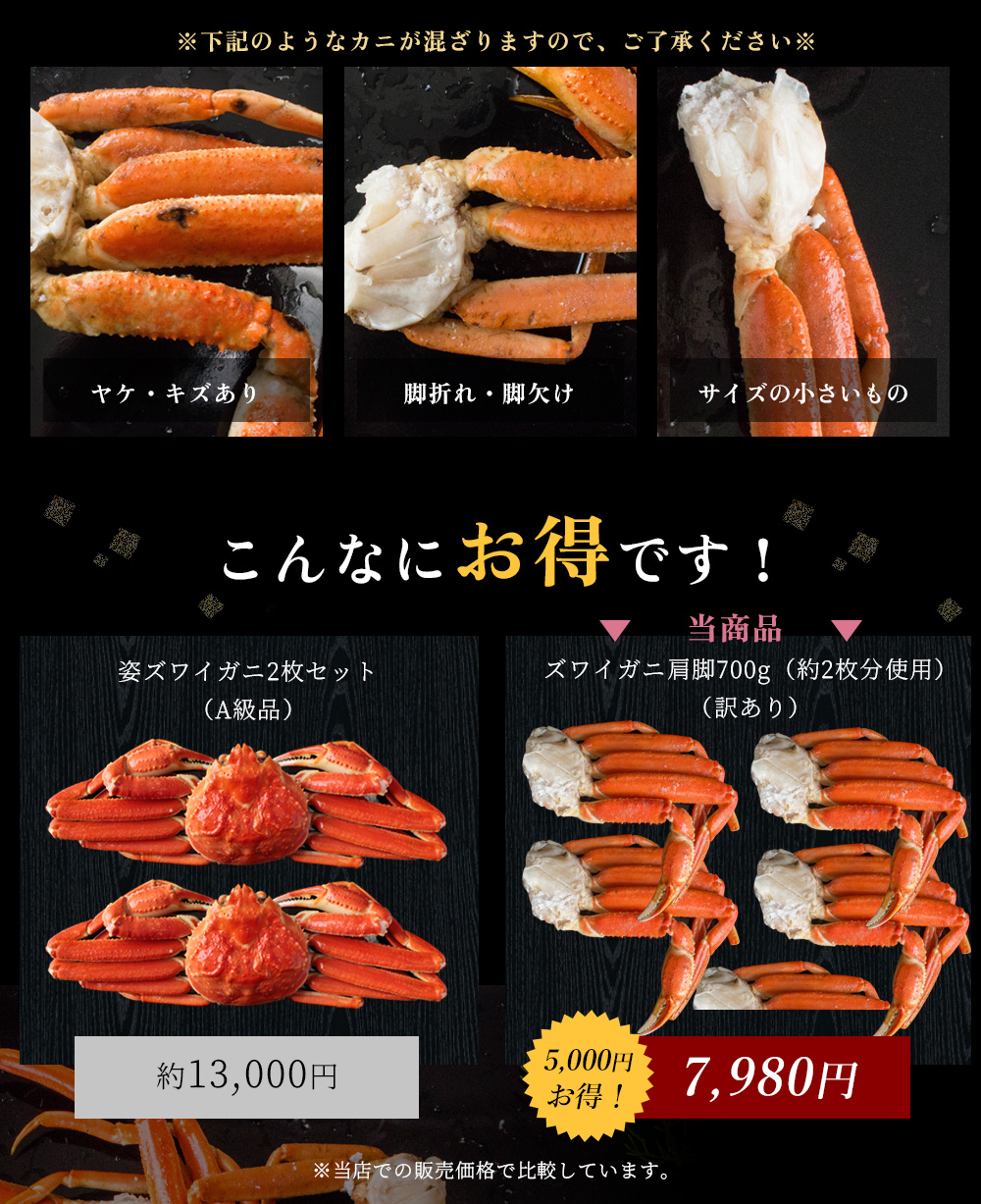 食べ応えのあるズワイガニの脚肉・肩肉のみを詰め合わせました。約2匹分のカニを使用しておりボリュームも満点、ご自宅用として大変お得なセットです。そのままはもちろんカニ鍋や焼きガニ等、心ゆくまでご堪能ください。