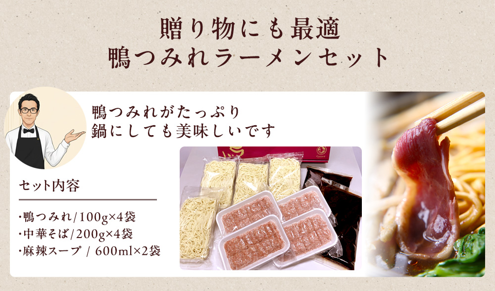 4人前(鴨つみれ100g×4袋、中華そば200g×4袋、麻辣スープ600ml×2袋)