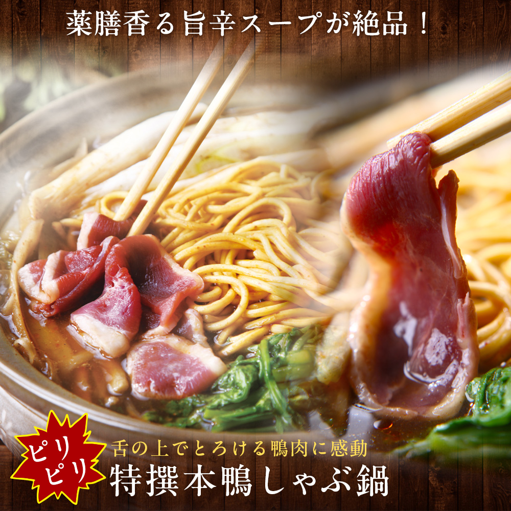 薬膳香る旨辛スープが絶品!本鴨ロース肉と野菜をからめて食べるヘルシー鍋。唐辛子を練り込んだ特製煮込みラーメンも付いた当店自信作です。