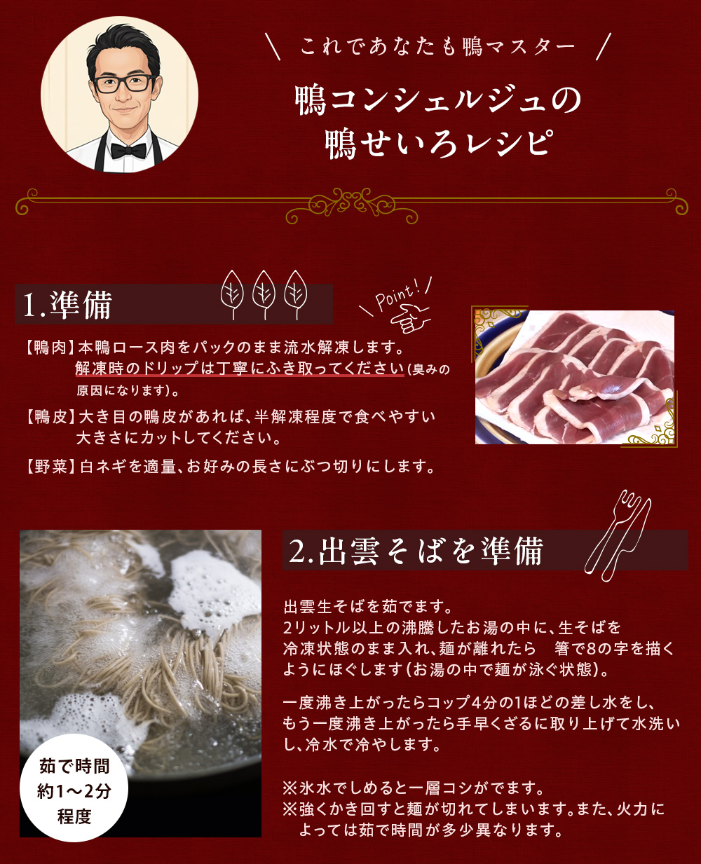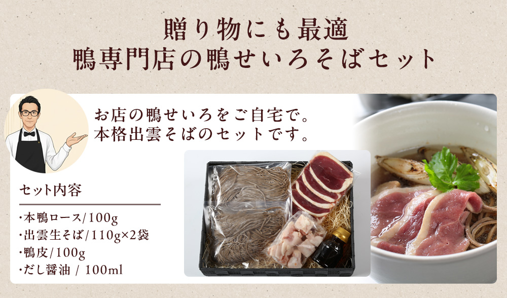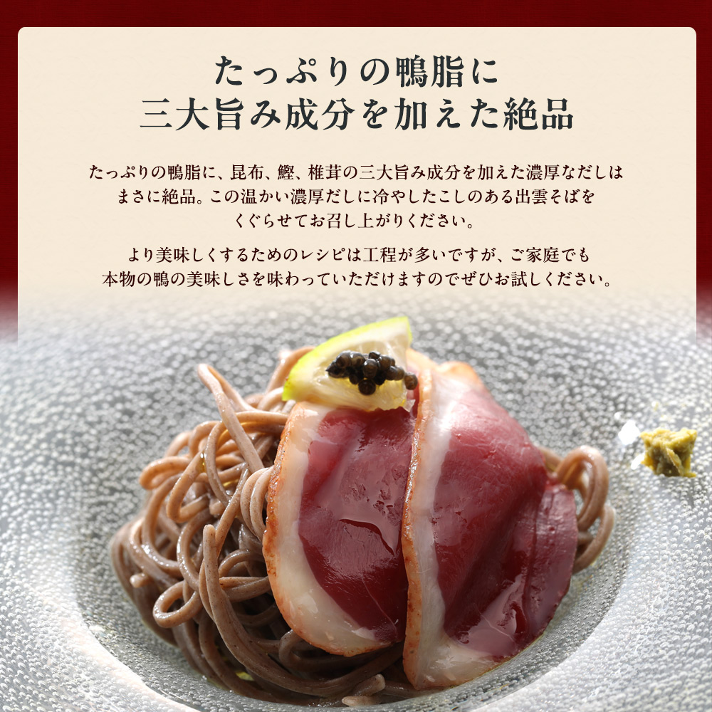 2人前(本鴨ロース肉100g、鴨皮100g、生そば110g×2袋、だし醤油100ml)