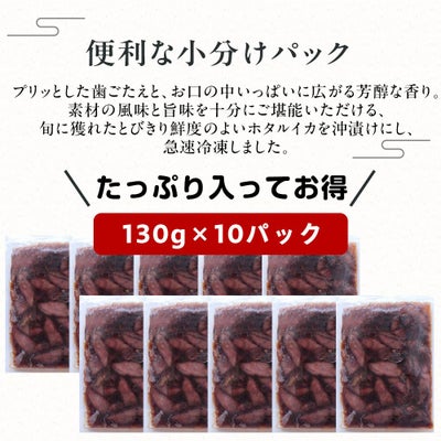 他の画像を見る プリッとした歯ごたえと独特の旨み ホタルイカ 沖漬け 醤油漬け 冷凍 1.3kg(130g×10パック) 小分け 日本海産 ほたるいか 送料無料(北海道・沖縄を除く) 価格 ¥ 6,980 税込 在庫切れ 詳細を見る お気に入りに登録する