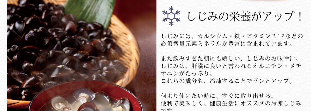 ブランドしじみとしてその名を馳せる宍道湖産大和しじみ。 身が肉厚で味も濃厚、旨み成分のコハク酸などアミノ酸類も豊富に含まれます。さらに冷凍熟成で旨みも栄養もアップ。ご家庭用のみならずご贈答用にも安心の、砂抜き済・冷凍パックでお届けします。