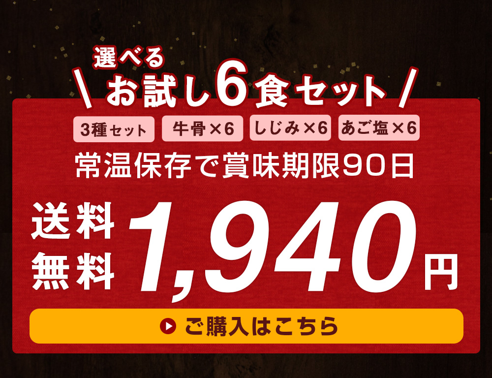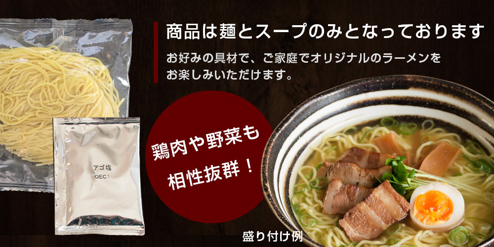 【あご塩スープ】たん白加水分解物(国内製造)、食塩、植物油脂、ポークエキス、しょうゆ、砂糖、焼あご粉末、野菜エキス、こんぶエキス、煮干しエキス、香辛料/調味料(アミノ酸)、酒精、増粘剤(キサンタンガム)、ビタミンB1、(一部に小麦・ごま・豚肉・大豆を含む)