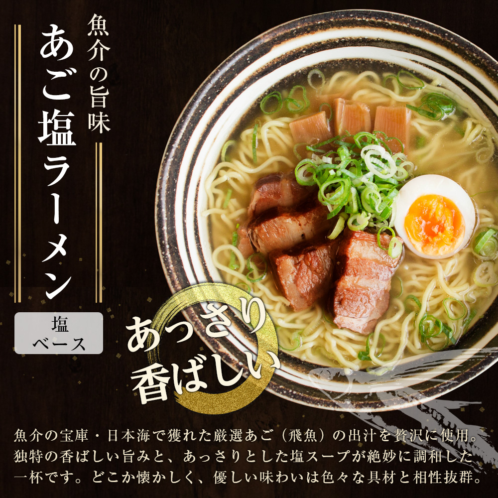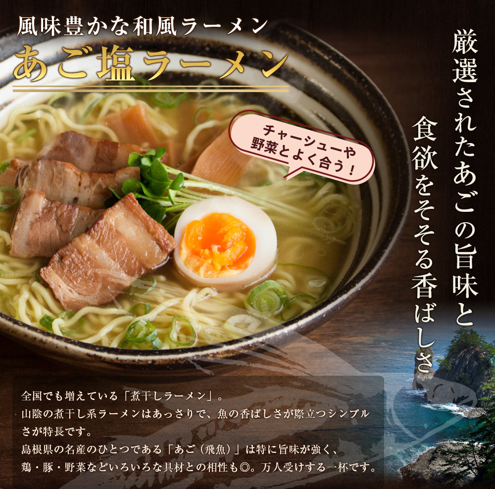 【あご塩ラーメン】エネルギー293kcal/たんぱく質10.6g/脂質3.7g/炭水化物54.1g/食塩相当量5.8g(1食135g当たり)