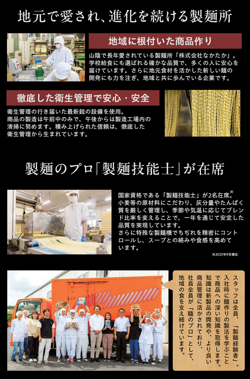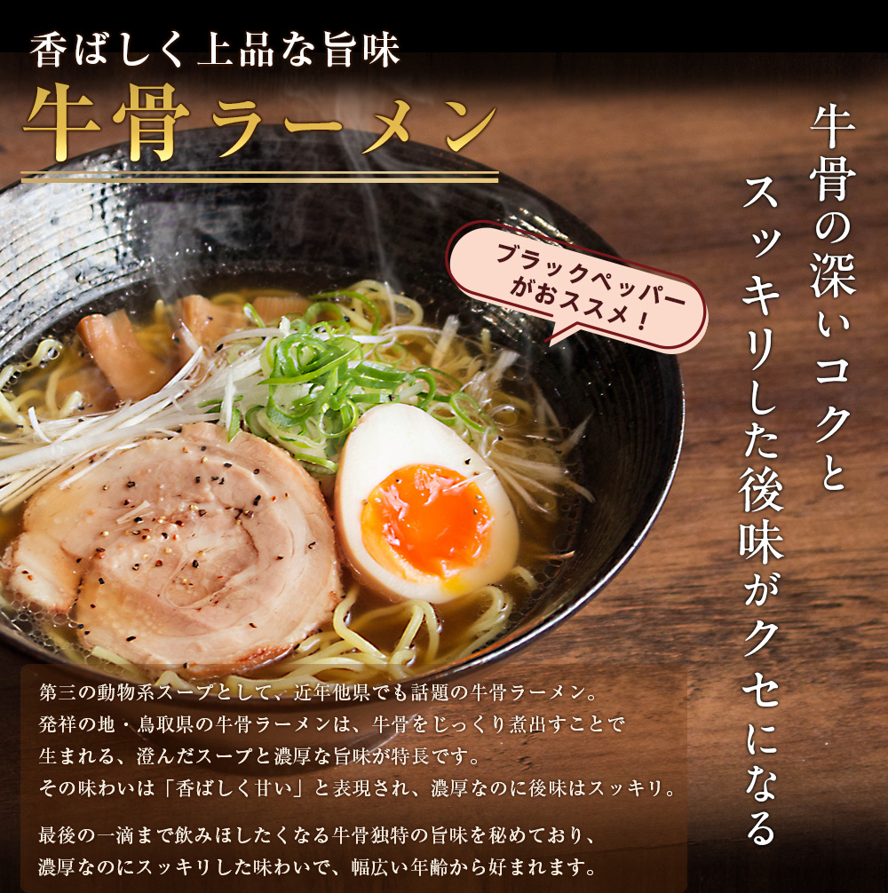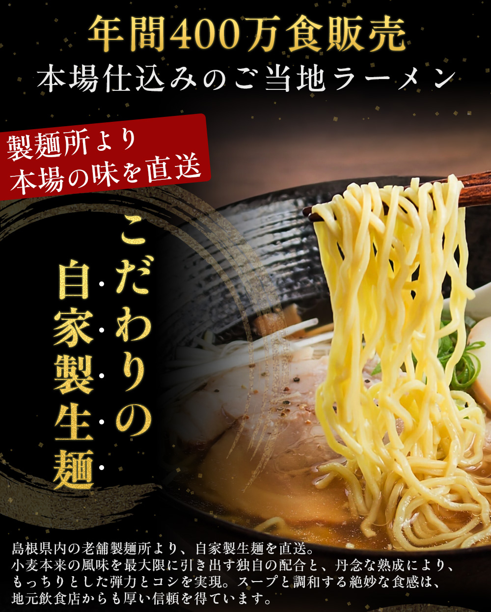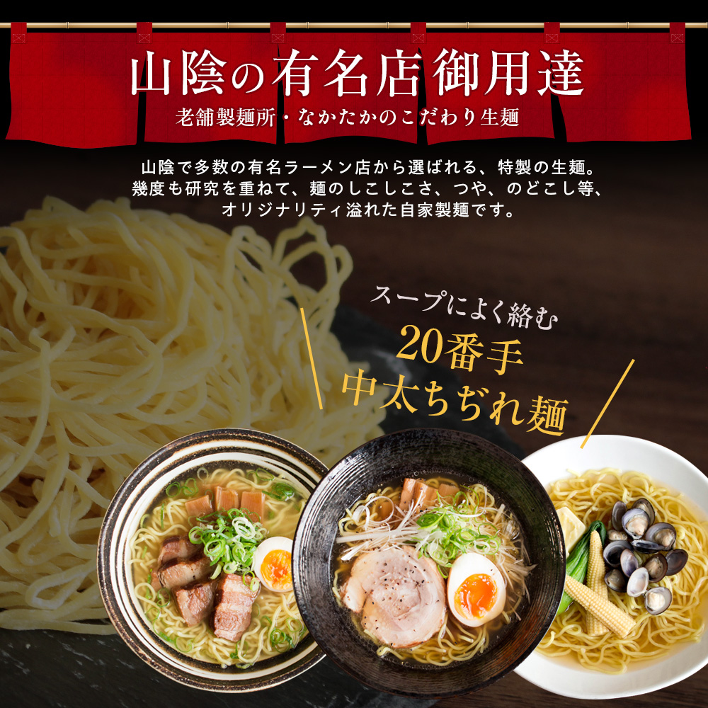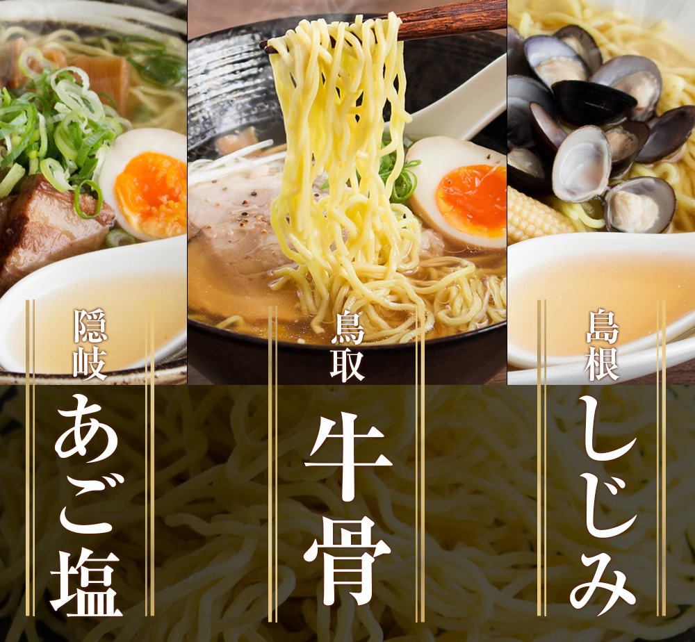 知る人ぞ知る“ご当地ラーメンの宝庫”山陰地方。鳥取県発祥のコク旨「牛骨ラーメン」、ブランドしじみの旨みを凝縮した「しじみラーメン」、香ばしい飛魚の出汁を使った「あごだしラーメン」。それぞれの地域で愛され続ける味を、老舗製麺所が取り揃えました。こだわりの生麺は、もちもち食感とつるつるののど越しの良さが特長。特製スープと絡む、プロの味をご家庭で手軽に。山陰ラーメンの魅力を、是非ご自宅でご堪能ください。