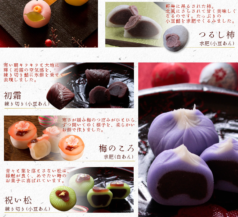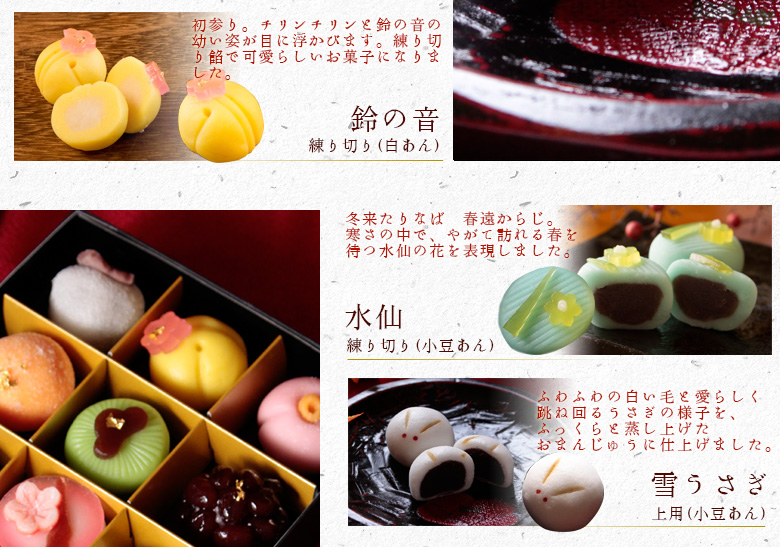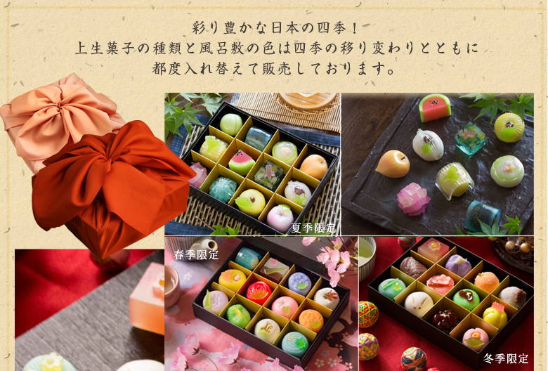 ※春夏秋冬の四季の移り変わりとともに、上生菓子の種類と色違いの風呂敷を都度替えて販売しております(2月・5月・8月・11月の年4回を予定/最新更新日2025.11.5)。