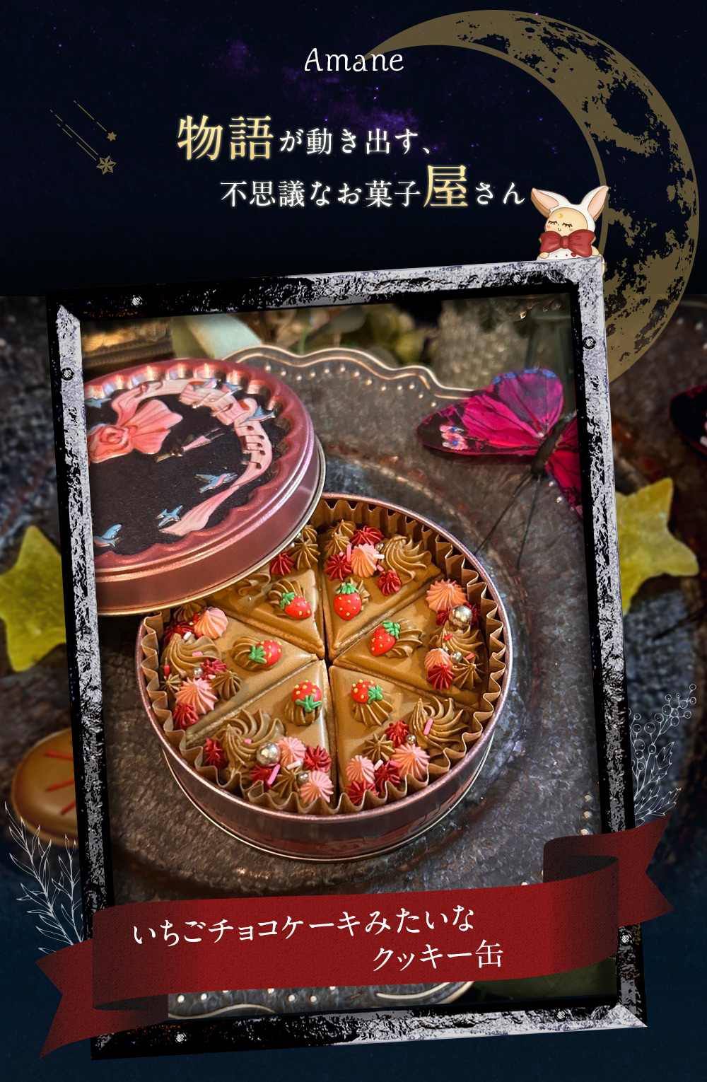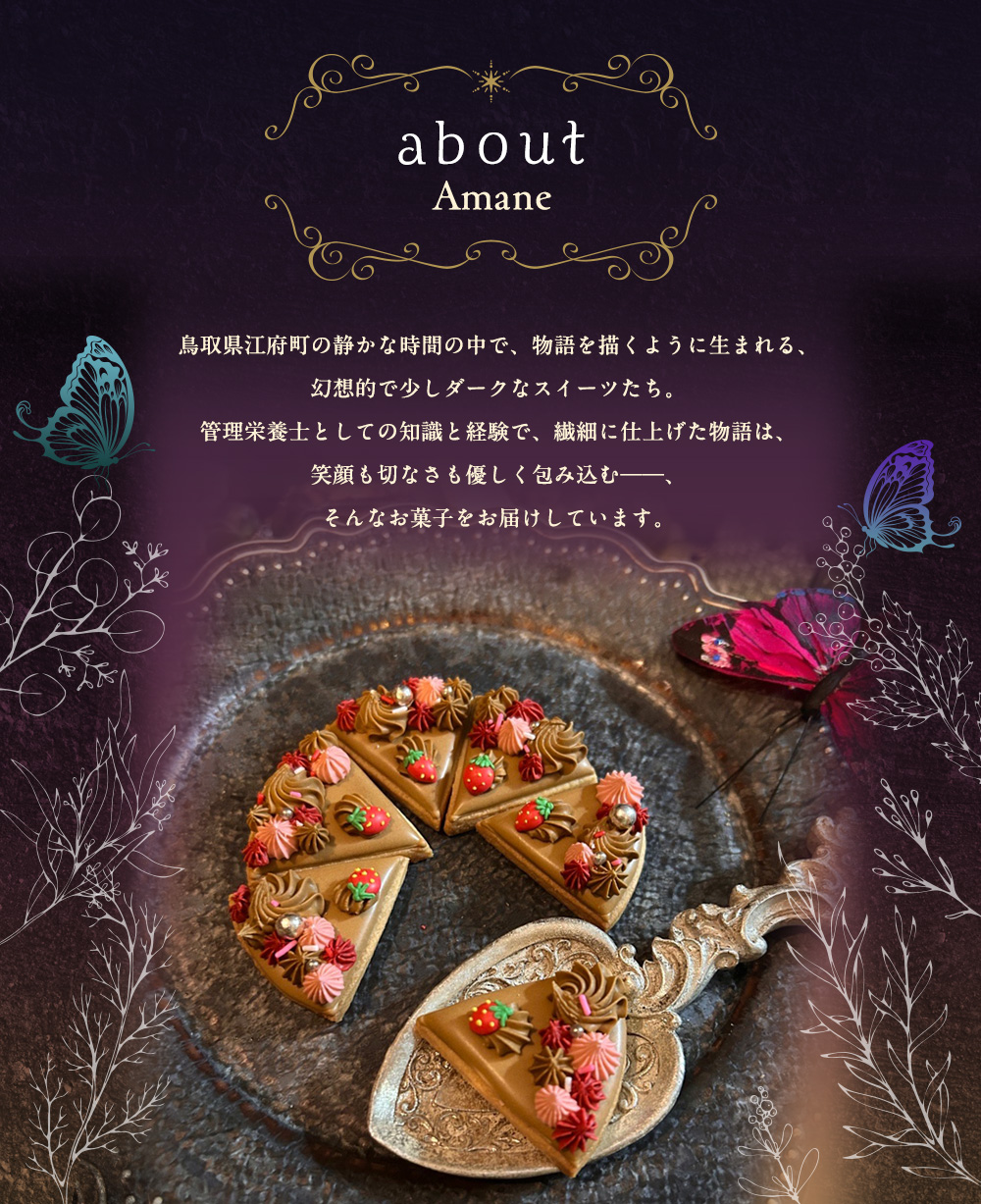 ひとつひとつ丁寧に仕上げられたスイーツたちは、まるで小さな物語の断片。笑顔も切なさも優しく包み込む、そんなお菓子をお届けしています。管理栄養士の知識と経験を活かしてつくる、甘さと独特の美しさが詰まった、やさしいお菓子です。