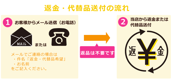 ※クレジット決済またはコンビニ決済をご利用のお客様が返金をご希望の場合は、請求手続きを停止いたします。代金引換をご利用の場合は、お客様のご指定の口座に商品代金をお返しいたします。